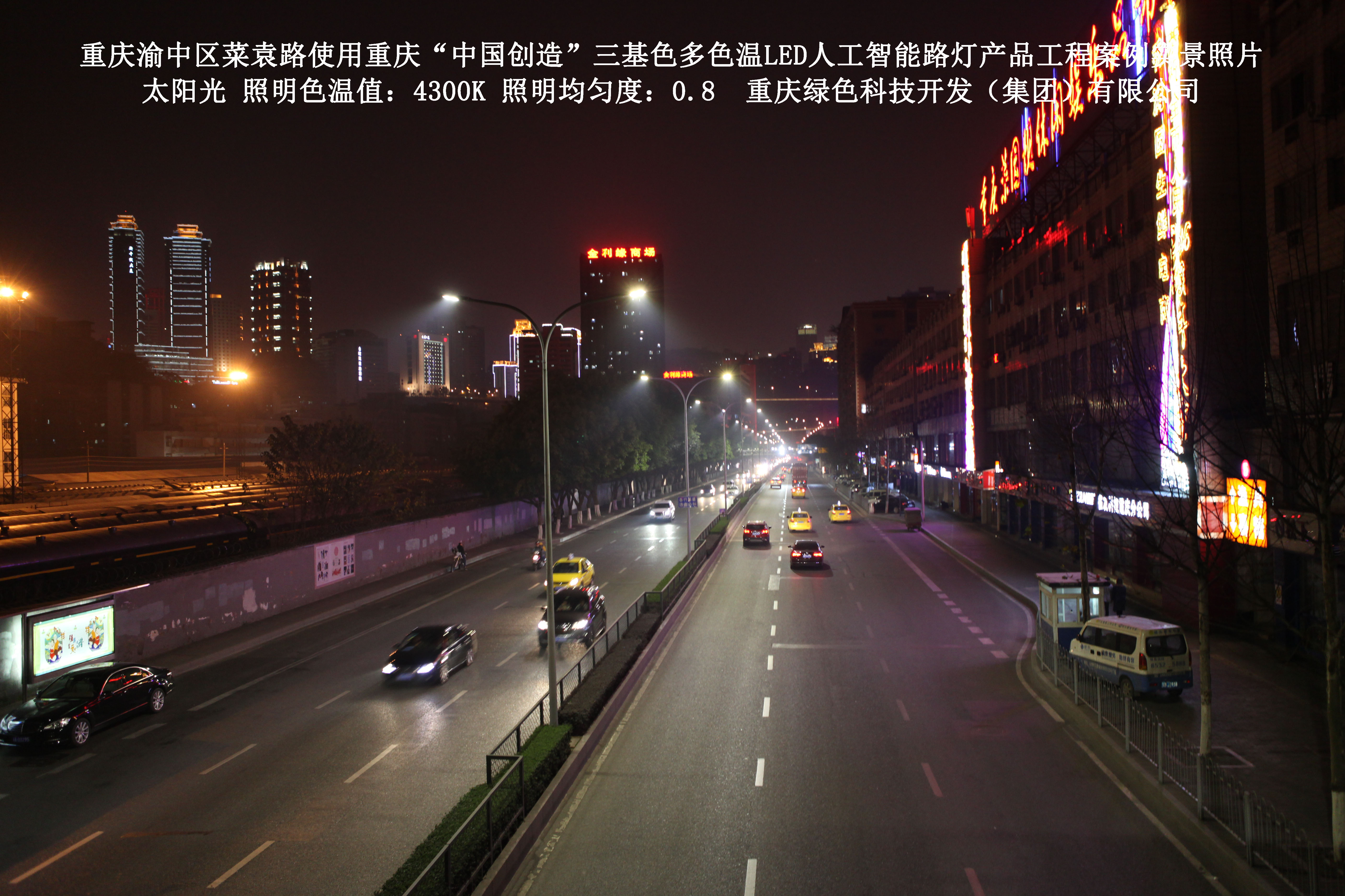 2013年10月,重慶市城市照明管理局使用了我司研發制造的重慶“中國創造”三基色多色溫LED人工智能路燈,對渝中區菜袁路實施了綠色照明科技節能改造工程,該工程已全面竣工。工程實施后,極大地提高了城市照明清晰度、燈光均勻度、舒適度。通過智能終端實現單燈感知、線纜防盜報警,與原高壓鈉燈相比,節能率60%以上,有效解決了關閉控制回路或間隔關燈方式造成的照明暗區,確保行人和車輛通行的安全,實現城市路燈照明系統的智能化管理,推進了智慧城市建設。