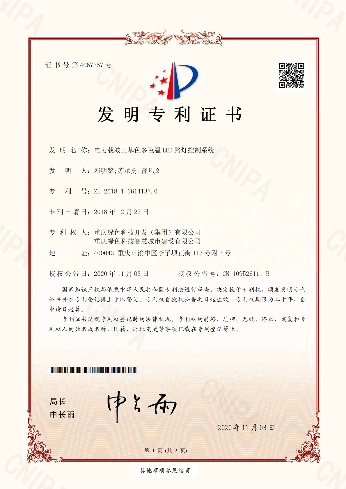 近日,重慶綠色科技開發(集團)有限公司再度喜獲一項國家發明專利《電力載波三基色多色溫LED路燈控制系統》(專利號:ZL 2018 1 1614137.0)。